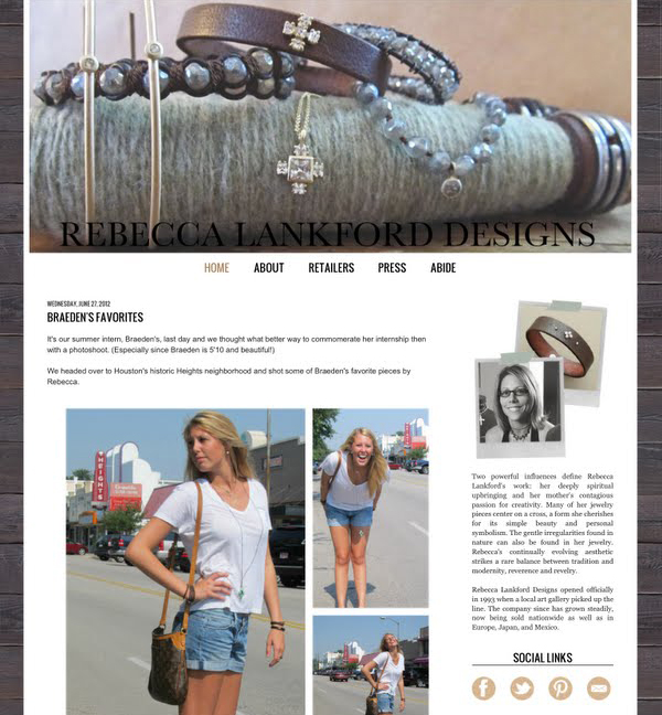 Rebecca is a super talented jewelry designer based out of Houston, and I had the pleasure of designing her blog. Her jewelry line has a bohemian feel to it - lots of leather, raw diamonds and stones, organic shapes and gilded crosses. I wanted to evoke that feeling in the blog with a rich, warm color palette and sophisticated pairing of serif and sans-serif fonts. Overall, I think it strikes a great balance between rustic and modern.